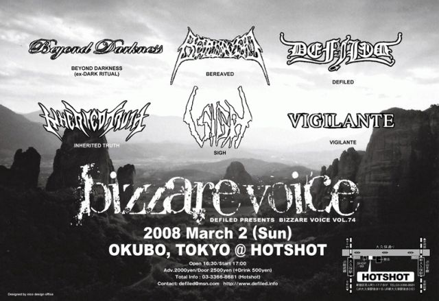 2008/3/2(日) 大久保Hotshot http://homepage3.nifty.com/hotshot/ BIZZARE VOICE VOL.74 共演:BEYOND DARKNESS、BEREAVED、DEFILED、INHERITED TRUTH、SIGH *(VIGILANTEは21:00~の出演です) OPEN 16:30/START 17:00 \2000/\2500+\500(1drink)