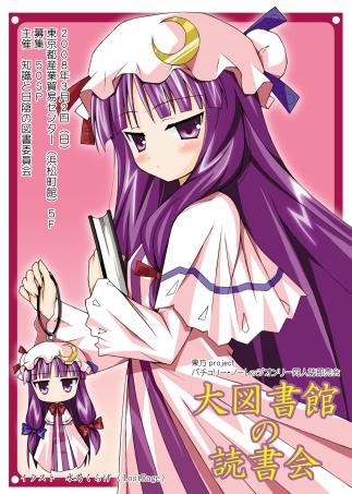 イベント告知させていただきます、来る3/2はパチュリー・ノーレッジ様のイベントです。フライング乙 ◆名称 大図書館の読書会 ◆開催日時 2008年3月2日(日) ◆会場 東京都立産業貿易センター浜松町館5階 ◆内容 東方project パチュリー・ノーレッジ様 オンリーイベント 同人誌即売会 ◆参加(募集)サークル様 50スペ ●主催 知識と日陰の図書委員会 詳細HP→http://www.daitoshokan.info/ ※また同時開催でアリス・マーガトロイドオンリーイベントも御座います。 詳細HP→http://tea-party.fsr.jp/ 2つ合わせて200