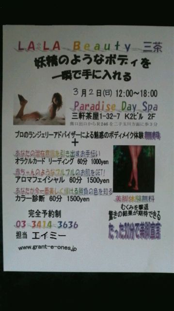 +☆+。゚+*:;;;:*:;;;:*゚。+☆+ LALA Beauty 三茶 +☆+。゚+*:;;;:*:;;;:*゚。+☆+ 3月2日(日)12:00〜18:00(最終受付17:30) Paradise Day Spa 三軒茶屋店 http://salon.ispot.jp/s/paradise-spa/ ボディメイク&マッサージサロン Paradise Day Spaがお届けするスペシャルイベント プロのランジェリーアドバイザーによる魅力のボディメイク体験と Beautyブースがセットになった、イベント限定メニューが受けられます ボディメイク体験 30分 無料 妖精の
