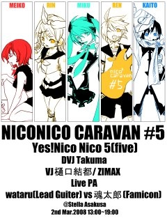 ニコニコキャラバンナンバー5、東京のイベント案内となります。 クラブ借り切ってみんなでカラオケ・大合唱のカオスイベント、東京3回目となります。皆様よろしくお願いいたします。 ニコニコキャラバン#5 Yes!ニコニコ5(ファイブ) ※ついでにTakuma三十路記念誕生祭(3/4が誕生日です) MAIN DJ/VJ Takuma Support VJ TANJENT/魂太郎/樋口結都 GUEST PERFORMANCE LIVE PA wataru(guitar)vs魂太郎(ファミコン) 宇宙人S&K(予定) 日時:2008年3月2日(日) 会場:浅草stella http://www.stella.ne.jp/ つくばエクスプレス