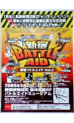 第1部 13:00開始 全席自由\3500(\4000) 小学生以下、60歳以上無料 ()は当日料金 第2部 18:00開始 飲み放題 VIP席\8000(\9000) 自由席\6000(\7000) 立見\4500(\5500) 第一部二部通し 自由席\7000(\8000) 2部終了後 打上げ&交流会 出演 第一部 戸井 克成プロデュース 大道芸(マニアックバージョン) ディンゴ 殺陣 『iconoclasm』 格闘技寸劇 劇団 Say!Do! 障害者プロレス DOG LEGS 提供試合1 鶴園 誠 vs 虫けらゴロー 元殴られ屋 パフォーマンス 晴留屋 明 ダンス