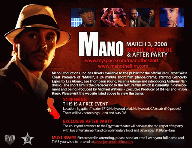 新しいサルサ映画「Mano」のスクリーニングとパーティーが来週月曜日3月3日にハリウッドのEgyptian Theaterで行われます。 映画は24分のショートフィルムで、Christian Oviedoも出演しています。 スクリーニング参加は無料ですが、予約が必要です。 スクリーニングは7:30pmと8:45pmの2回あります。 予約したい方は参加したいスクリーニングの時間と氏名を書いてpress@manothefilm.comまでメールしてください。 アフターパーティーはスクリーニングの後そのまま残れるのかどうかちょっと不明ですが、8:30pmから1amまで行われるそうです。 詳し