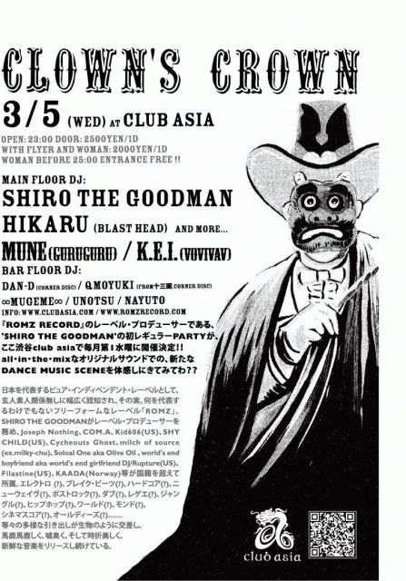 『ROMZ RECORD』のレーベル・プロデューサーである、'SHIRO THE GOODMAN'の初レギュラーPARTYが、ここ渋谷club asiaで毎月第1水曜に開催決定!! all・in・the・mixなオリジナルサウンドでの、新たなDANCE MUSIC SCENEを体感しにきてみてわ??? about ROMZ: ROMZ RECORD is a Tokyo-based Japanese indie label, it was started by SHIRO THE GOODMAN and COM.A, since 2001. For lots more info visit : www.romzrecord.com