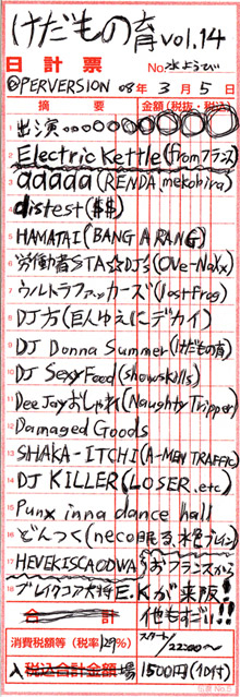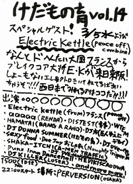 告知失礼します いや〜日本って面白くないですね〜 うちの婆ちゃんまでも言ってるわ。。。 from東京とかノルマとか云々カンヌン・・・ホンマどーでもええわ バロウズとか読んで「あ”〜俺もビートニクスや〜」言うてるジャリガキヒッピー大国 そんな死に腐った日本に(めっちゃいいパーティーもなかには一杯あるよ♪)、、、何故か漂流・・・・し・・た・・・ どヘンタイ大国おフランスからこれまた奇怪なビート魔術師ブレイクコア大将の、、 electric kettle!!!!!が来日来osakaしちゃいますっっ!!!!! とりあえずmy spac