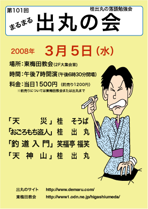 出番:桂そうば 「天災」 桂 出丸 「おごろもち盗人」 笑福亭福笑 「釣道入門」 桂 出丸 「天神山」 --------------------------------- 料金:前¥1200 当¥1500 開演:午後7時 場所:東梅田教会