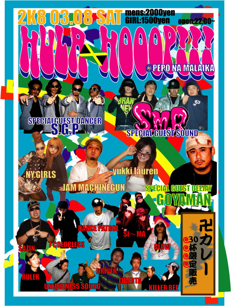 3.8 (土) @PEPO OPEN/22:00〜ALL NIGHT?? MEN 2000 WOMAN 1500 HULA−HOOOP!! SPECIAL GUEST SOUND ・SMOKE MADE ROCK from東京 GUEST DJ ・GOYAMAN(POWEPLYERZ.NEW MONEY) from東京 GUEST DANCER ・S.G.P from東京 GUEST SOUND ・JAM MACHINGUN from大阪 SOUND ・UNIQUENESS ・LIBERTA from 大阪 ・KILLER BEE DJ ・SAZIN ・SHUNDEE ・DRIVER ・RULER and more... DANCER ・NY.GIRLS from大阪 ・DANCEPATROL from大阪 ・GLOW ・SI-MA ・7 COLORLESS 和歌山のヤバイダンス!!!! 東京、