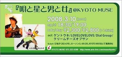 春の関西ツアー〜Dial Groupレコ発編〜 「唄と星と男と女」 ■2008.3.10(月) @京都ミューズ 075-223-0389 http://www.arm-live.com/muse/kyoto/main.html w / Dial Group 、クリームチーズオブサン、LOVELOVELOVE open 18:30 / start 19:00 前売り¥2,300 / 当日¥2,800 ※バンドセット(+ Dial Group) バックはDial Group。京都でバンドセットのライブは久々。