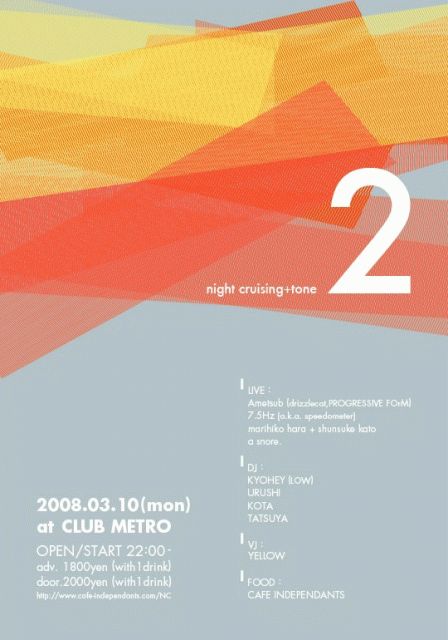 2008.3.10(mon) 22:00〜 "night cruising + tone " @club metro http://www.metro.ne.jp/ charge : adv.2000yen(w1d) / door.1800yen(w1d) LIVE : Ametsub(PROGRESSIVE FOrM、Drizzlecat) 7.5Hz a.k.a speedometer. marihiko hara + shunsuke kato a snore. DJ : KYOHEY(LOW) URUSHI(night cruising) KOTA(night cruising) TATSUYA(night cruising、UNDERMINE) VJ : YELLOW(night cruising) FOOD : CAFE INDEPENDANTS 前売りチケット購入(取り