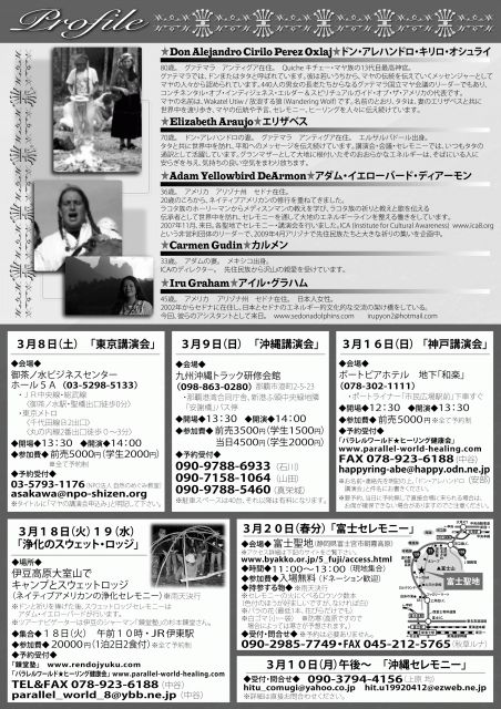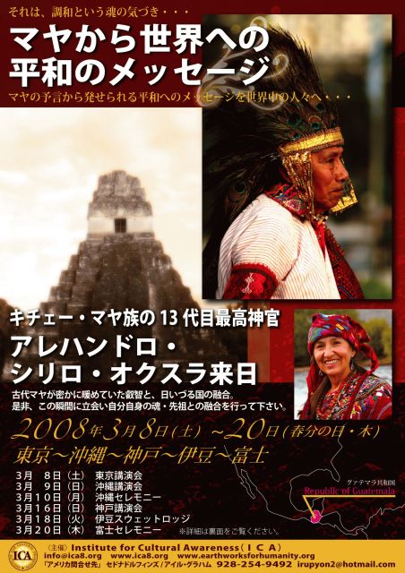 *3月10日、沖縄セレモニー の受付・問い合わせ先が変更になりました。 今後の問い合わせは、下記までどうぞ。 090−1948−7460(田原) tirurushi@yahoo.co.jp それから、以下、内容を追加してます。 沖縄セレモニー(世界平和の祈り) マヤ族の13代目の最高神官アレハンドロ・シリロ・オクスラ、他と、沖縄の神人とともに、世界平和の祈りのセレモニーが行われ、平和の祈りをいたします。 皆様のご参加、ご協力、よろしくおねがいします。 *浅野瑞穂、他による、奉納舞『天女の舞』も行われる