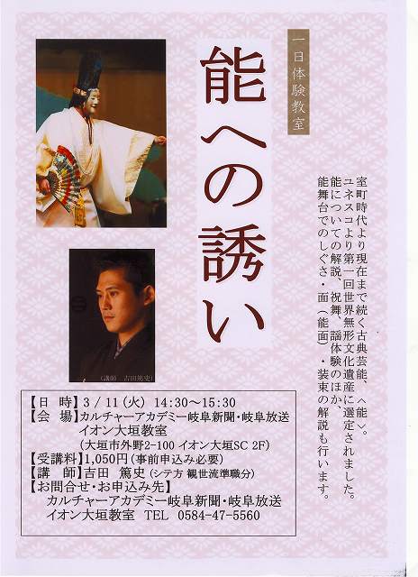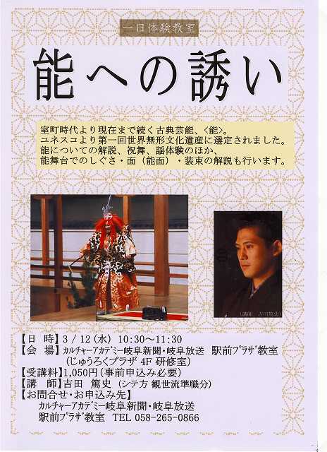 ひっさしぶりの岐阜県内での講演です。 能楽を全くご存知ない方にもご理解いただき、 楽しんでもらえる為に行っている講演です。 世界に誇る650年もの歴史をもつ伝統芸能、能楽に触れてみませんか? きっと楽しんでもらえると信じています。 今回は2日連続で大垣市・岐阜市で行います。 頑張ります! 『能への誘い』 日時:平成20年3月11日(火)14:30〜15:30 会場:カルチャーアカデミー・イオン大垣教室(大垣市外野2-100 イオン大垣SC 2F) 内容:第1回世界無形遺産に登録された『能楽』を、 話・
