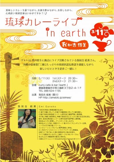 告知失礼します。 【琉球カレーライブ in earth 】 美味しいカレーを食べながら、お酒を飲みながら、お茶しながら、 心地良い琉球音楽はいかがですか?!♪ ゲストは、香川県をに拠点にライブ活動されている我如古 絵美さん。 沖縄の弦楽器『三線』たっぷりの琉球民謡&歌謡を堪能しながら 楽しいひとときを是非ご一緒に! 日時 3/11(火) 1stステージ 20:30〜 2ndステージ 21:30〜 会場 curry cafe & bar 『earth 』 徳島県徳島市中常三島町3丁目2