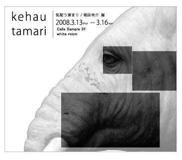 こんにちは。告知失礼致します。 奈良市にあるフリースペース・sample white roomです。 当方は音楽を主軸として若いアーティストの表現活動をサポートする目的で活動を行っています。 きょうより4日間、奈良市在住の若手作家・福田侑介が、 写真、映像、絵画を用いた展覧会を行います。 作家の多様な才能が垣間見られる内容となっておりますので、 興味をお持ちいただけましたら、ぜひ足をお運びください! sample white room ■福田侑介《気配う溜り》展 会場:sample white room(cafe sample2F) 2008.3.13(木)-3.16