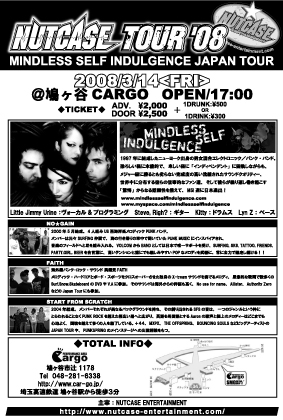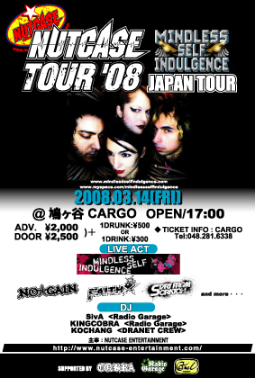皆さん準備はいいですか? また酔っぱらいに行くゼ---- ホワイトデーでデートが忙しい人も参戦する価値有りですぞ!!! --2008年3月14日(金)-- <NUTCASE TOUR'08/ MINDLESS SELF INDULGENCE JAPAN TOUR> ◆埼玉鳩ヶ谷CARGO ・OPEN/START 17:00 ・チケット 前売り2000円/ 当日2500円 -<LIVE ACT>- ・MINDLESS SELF INDULGENCE(from NY) ・NO☆GAIN ・START FROM SCRATCH ・FAITH ・〇〇〇〇警察 ・8ASSION -<DJ's>- ・SivA ・KINGCOBRA ・KOCHANG 協力:RADIO GARAGE/CO.BRA/CAMEL STUDIO/A2/NUTCA