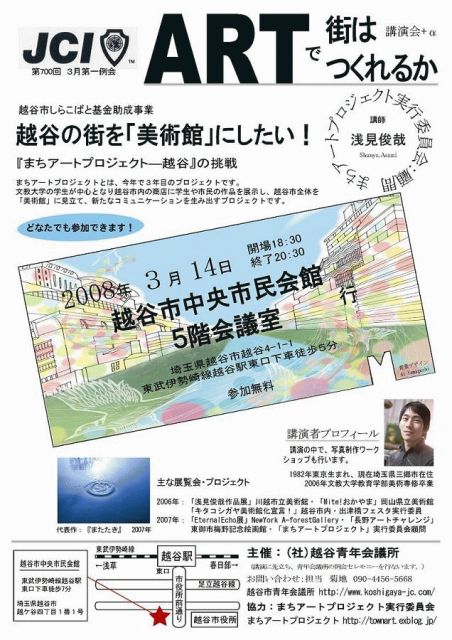 コミュの皆様 越谷を「美術館」に!―まちアートプロジェクト講演会のお知らせをさせてください。 『アートで街はつくれるか?まちアートプロジェクトの挑戦』 まちアートプロジェクト(MAP)とは「越谷市しらこばと基金」の助成をうけ、文教大学生を中心に他大学生や作家と越谷に多数存在する商店と一緒にプロジェクトを進行する参加型作品展です。 商店とともにつくるアート作品を越谷の色々な場所に展示することで、その作品を通して住民と交流を生み、越谷という地域そのものを「美術館」にしてしまおう!というプ