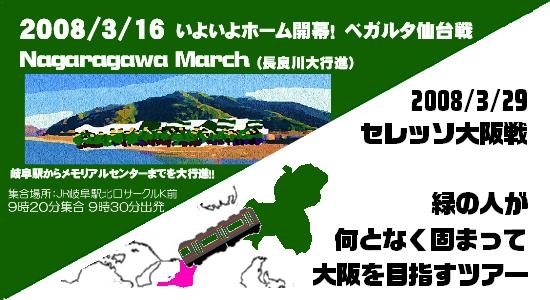 3月16日(日)は待ちに待ったFC岐阜のJリーグホーム開幕戦です。 FC岐阜のホームゲーム開催を岐阜の街中でアピールすると同時に、 共に戦うサポーター同士の交流を目的として、 FC岐阜グッズやレプリカユニフォームを身につけて 駅からメモリアルまで行進する「Nagaragawa March(長良川大行進)」 を企画しました。 飛び入り参加大歓迎です! FC岐阜グッズを身につけた集団が駅から岐阜の街を北上しますので、 お気軽に声をかけてください。 --------------------------------------------------------------- 【日時】 3月16日