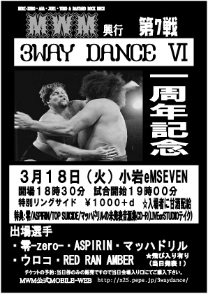 MWM興行第7戦 〜MWM旗揚げ1周年記念大会〜 『3WAY DANCE?』 3月18日(火) 19:00スタート 当日券のみ¥1000 出演 ・ASPIRIN ・零-zero- ・マッハドリル ・ウロコ ・RED RAN AMBER 当日1バンド飛び入り有り 入場者にVA:CD-R配布 なお1周年を記念して甘酒配給いたします。 新体制となったASPIRINのお披露目GIG。革命VAなどに参加していた元スレイバーのウロコやRED RAN AMBERが初参戦など盛りだくさん。もちろん零やマッハドリルも激熱なLIVEを展開!当日乱入してくるバンドは何か??平日の仕事帰りにふらっと遊びにきてく