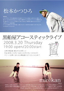 前売2,500円/当日3,000円(共に1ドリンク) 「瀬戸内音楽界」などでおなじみの、福岡のバンド「SO」のヴォーカルだった松本かつひろ氏のソロと、mirekanの2本立てです。 (プロフィールは下に記載しております) ご予約は、私へのメッセージ(明日4時くらいまで) もしくは 087(826)3636 黒船屋さんの方(5時〜7時)へご連絡くださいませ。 ------------------------ 松本かつひろPROFILE アカペラグループでの活動を経たのち自身のバンド「SO.」を結成。九州を中心に活動し、全国ツアーもこれまで50カ所以上行い各地で反