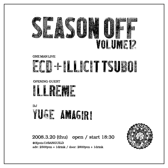 関西ではニューアルバム『FUN CLUB』(JET SETからは7inch)リリース後の初ライブで、しかもECDさんの久方ぶりのワンマンライブですので、どうぞお見逃しなく! また、イルリメさんにはOPENING GUESTとしてもライブをして頂きます! 下記アドレスよりチケット予約も受け付けておりますので、よろしくお願いします!! 『SEASON OFF vol.12』 2008.3.20 (thu) open / start 18:30 @京都UrBANGUILD adv: 2500yen + 1drink / door: 2800yen + 1drink LIVE: ECD + ILLICIT TSUBOI(ワンマン) OPENING GUEST: イルリメ