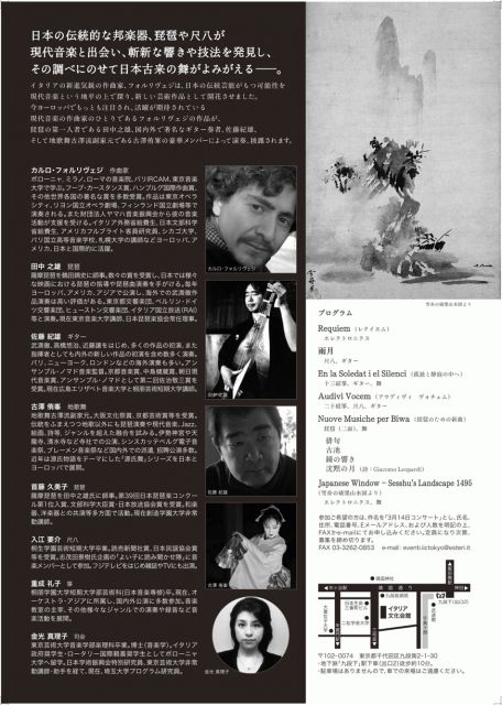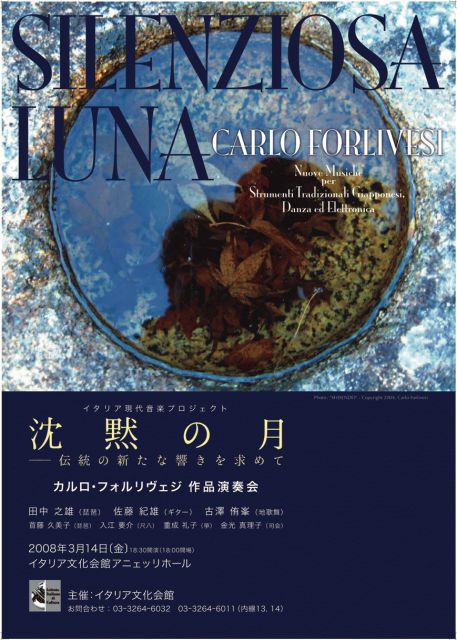 イタリア現代音楽プロジェクト Silenziosa luna 沈黙の月 ー 伝統の新たな響きを求めて 『カルロ・フォルリヴェジ 作品演奏会』 京都での初めての作品演奏会を開くこととなりました。 地元京都で出来るのはこの上なく嬉しいです! たくさんの方々のご来場、心よりお待ち申しております。 田中 之雄(琵琶)、古澤 侑峯(地歌舞) 、首藤 久美子(琵琶) 、金光 真理子(司会) 日時:2008年3月20日〔木・祝〕 15:00開演 場所:イタリア文化会館・京都 〒604-8205 京都市中京区三条町344-1 新町
