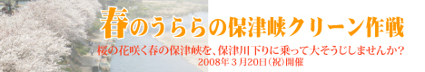 プロジェクト保津川では、京都・亀岡が世界に誇る自然・文化遺産である保津峡の魅力をもっと身近に感じていただこうと「春のうららの保津峡クリーン作戦」を実施します。 春の保津峡に舟をこぎだし、季節の移ろいを感じながら保津峡に学び、美しくするイベントです。ぜひ、ご参加ください。 このイベントに関する質問も、こちらで受け付けています! ■■ 春のうららの保津峡クリーン作戦 ■■ http://hozugawa.org/program/clean.html 目 的:先代から受け継いできた保津川の自然環境を守り活かし、 将来に引き