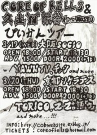 久土’N’茶谷と行くの関西ツアー その二 CxOxB!? precious Deli!very @京都出町柳 ソクラテス adv.¥1,500/door.¥2,000 (+1drink) LIVE: core of bells 久土’N’茶谷 (from MOST) z−z言語「ウ」 TORICO and more... チケット予約 coreofbells@hotmaill.com 阿鼻叫喚バンドz−z言語「ウ」もでますよ。 さぁ、どっちも!どっちも!