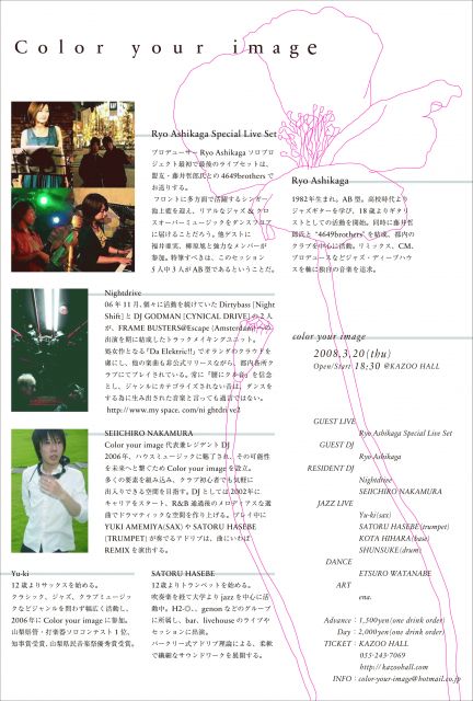 *音楽イベントの御案内をさせていただきます* 前回のMAKAI、DJ LUUに続き、今回はリアルなジャズ・クロスオーヴァーサウンドをフロアに響かせるプロデューサーRyo Ashikagaが甲府に初登場する! HMV・DMRでチャートを揺るがし、CM・リミックスワークにも定評のある次世代の大型新人として恐れられているRyo Ashikaga! 世界に先駆け今回の山梨ライブが幻の初ライブとなる! 今回の山梨ライブのために綴られた完全オリジナル曲を、藤井哲郎、池上藍、福井亜実、柳原旭の豪華メンバーによる生ライブで披露する! DJ
