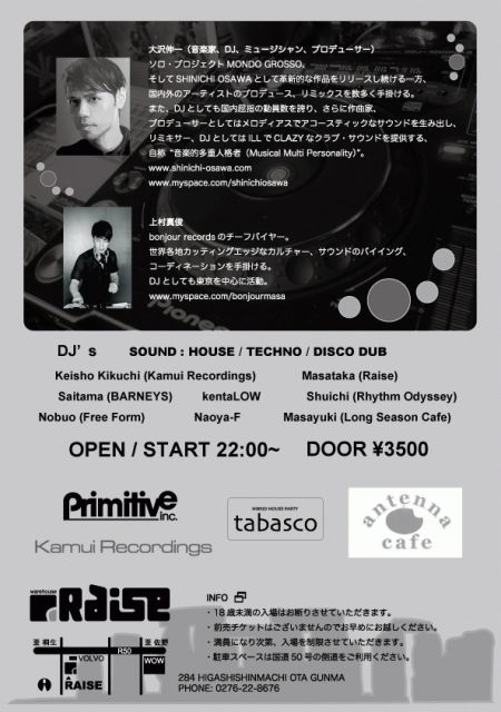3月21日、大沢伸一(MONDO GROSSO)さんがGUEST DJです!!