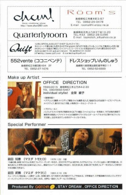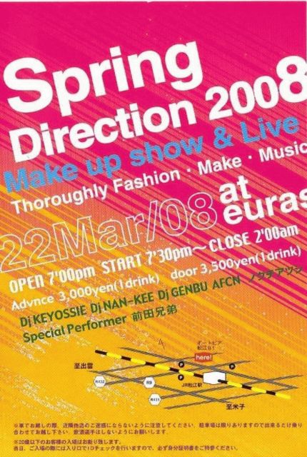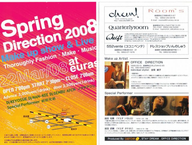 突然ですが メイクアップショー! 春物ファッションショー! ウェディングファッションショー! ヘアーカットショー! ヘアーメイクショー! 音楽! ライブ! エンターテーナー! 色々ありのイベント企画しました★ Spring Direction 2008 場所 松江ユーラス チケット前売り ?Drink付き\3000 チケット当日 ?Drink付き\3500(前売りで売り切れの場合はありません) *タイムスケジュール 19:00 OPEN 19:30 START 20:00 DJ 21:00 SHOW 22:00 LIVE&ENTARTIMENT AFCN 野口厚司・・・http://ww
