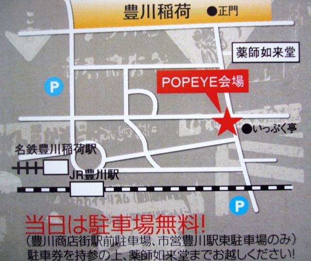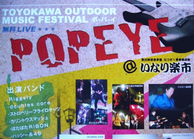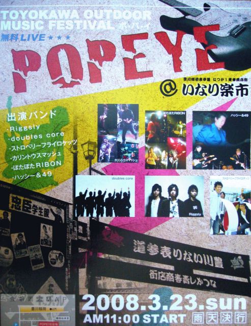 ついに3月になりました〜! 3月23日(日)は、豊川稲荷界隈の商店街イベント「いなり楽市」が開催されます! (10時〜16時まで開催) 名物ともなっている「ちんどんや」に加え、ストリートパフォーマンス、軒下戸板市、地元中学生・高校生によるブラスバンド、昔なつかし人力車、串かつ・豚汁・昭和揚げの出店など これだけでも盛りだくさんの内容なんだけど、今回はなんと!!!!! 「商店街で野外ライブ!」やっちゃいます ※野外ライブなんで当然、無料だよ〜 「POPEYE」は、「いなり楽市