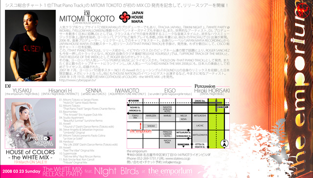 ダンサブル&スパークルな、アッパー・チューンをつめこんだ MITOMI TOKOTO 初のミックスCD発売を記念して、3/23(日)名古屋 THE EMPORIUM にて、リリースパーティー開催決定!! Mitomi Tokoto 初のTHE EMPORIUM の出演となります! ◯DAY:2008年03月23日(日曜日) ◯PARTY NAME:- the WHITE MIX - Release Party feat.「Night Birds」 @ the emporium-Nagoya ◯PLACE:the emporium-Nagoya http://www.statexs.co.jp/index0.html ◯CHARGE:ENTRANCE.2,500yen-1Drink / with Flyer 2,000yen-w1D ◯OPEN:21:00-Mid ◯GUEST DJ:MITO