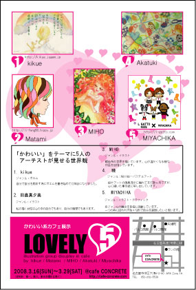 別れや出会いが近くなる3月。良い思い出作りにあなたも カフェで可愛いイラストやポエムを見ながらマッタリしませんか?? 詳細は下記の通りです イベント名 :LOVELY 5(ラブリー ファイブ) テーマ :「かわいい」をテーマに5人のアーチストが イラストやポエムを展示します。 期間 :3月16日(日)〜3月29日(土) ※23日の12:00〜17:00はアーチスト本人が 作品紹介したり、販売などのイベントをします アーチスト : kikue(ポエム)、
