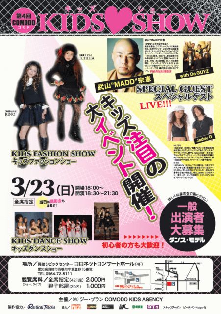 「第4回 COMODO KIDS SHOW(コモド・キッズ・ショー)」 at 岡崎シビックセンター4F コロネットコンサートホール OPEN 18:00 START 18:30 全席指定 ¥2,000 (親子部屋¥1,000有り) キッズのダンスショー、ファッションショーのイベントに 武山MADD宗憲 with Da GUYZがライブゲストとして出演。 Jadey-GのKen-G&Natsuもライブで参加しての楽しいイベント。 お問い合わせ COMODO KIDS AGENCY TEL 0564-87-3811 FAX 0564-8