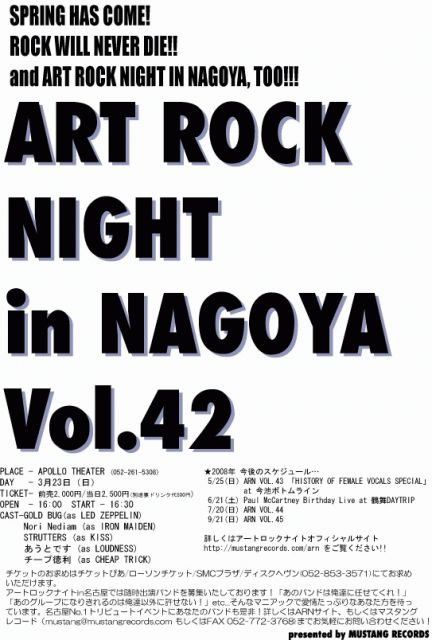 3/23(日) ART ROCK NIGHT in NAGOYA Vol.42 新栄アポロシアター(052-261-5308) 開場:午後4時 開演:午後4時30分 前売2,000円 当日2,500円(別途ドリンク代500円が必要です) 出演: STRUTTERS (as KISS) THE GOLD BUG (as LED ZEPPELIN) NORI NEDIAM (as IRON MAIDEN) あうとです (as LOUDNESS) チープ徳利 (as CHEAP TRICK)