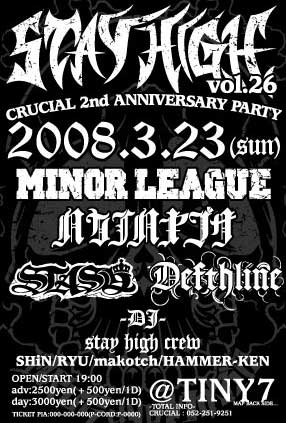 3/23 (sun) 「STAY HIGH 26 CRUCIAL 2nd ANNIVERSARY PARTY」 ■Place:今池 Tiny 7■ ■Open/Start 19:00■ ■adv:\2500-(+500yen/1D)/day:\3000-(+500yen/1D)■ ■BAND■ MINOR LEAGUE ハカイハヤブサ STASH Defthline ■DJ■ STAY HIGH CREW SHiN (DxAxM) RYU (Crucial) makotch HAMMER-KEN チケット予約は、メッセージでもここに書き込んでいただいてもどちらでも大丈夫です★ 3月後半は楽しいイベント続き!! 行くっきゃねー!!!!