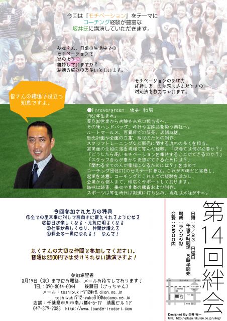 今回はコーチングの坂井和男氏を講師に向かえ 「モチベーション」というテーマで講演してもらいます! 人生一度きりなんで常にハッピーに絶好調にすごしたいですよね? 今回はモチベーションの維持だけではなく、 モチベーションの上げ方等、様々な手法などを学べます。 もちろん講師の方には各テーブルを回っていただき みなさん個人個人の方とコミニケーションを図っていただきます! 学び以外にもたくさんの出会いがあり そこから 「一生の絆」が生まれます! ぜひ、この機会にたくさんの大切な仲間と遊びに来て下さい! 今回は、