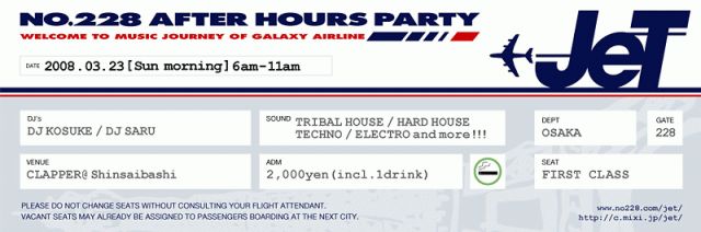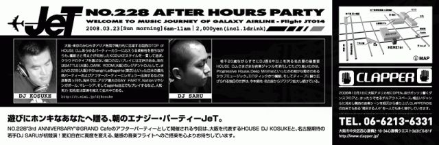 NO.228"3rd ANNIVERSARY"@GRAND Cafeのアフターパーティーとして開催される今回は、大阪を代表するHOUSE DJ KOSUKEと、名古屋期待の若手DJ SARUが初競演!変幻自在に高度を変える、魅惑の音楽フライトへのご搭乗を心よりお待ちしています。