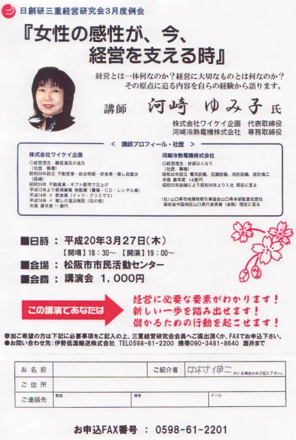 山口県から凄い女性が松阪にやってきます。 株式会社ワイケイ企画 代表取締役 河崎 ゆみ子 講師 河崎さんのお話を聞くと、経営に必要な要素がわかり、新しい一歩を踏み出す事ができ、儲かる為の行動を起せます。 女性経営者の皆様や経営者を目指す皆様、女性の感性をどのように生かすかお悩みの方!・・・必見です! 河崎さんに会いに来て下さい!そして講演終了後未来の事を2次会で語りましょう!お待ちしております。 日時 平成20年3月27日(木) 会場 18:30から 開演 19:00から 場所