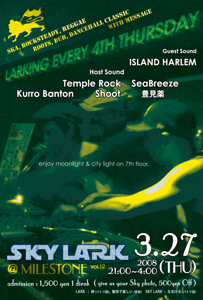´ÉÍý¿ÍÍÍ ¹ðÃμºÎ餷¤Þ¤¹ ¢£SKY LARK VOL.12¢£ 3·î27Æü(ÌÚ) ÆáÇÆ Çñ @mile stone 21:00¡Ámorning ¡ï1500(with 1DRINK) ¶õ¤Î¼Ì¿¿¤ò»ý¤Ã¤ÆÍè¤Æ¤¯¤ì¤¿Êý¡ï500off!! ¶õ¤Î¼Ì¿¿¤Ï¥×¥ê¥ó¥È¥¢¥¦¥È¤ä¥³¥Ô¡¼¡¢»¨»ï¤ÎÀÚ¤êÈ´¤¤Ê¤É¤âÂç´¿·Þ¤Ç¤¹! Ëè·îÂè»ÍÌÚÍ˳«ºÅ¤·¤Æ¤ª¤ê¤Þ¤¹SLY LARK! º£·î¤ÏÆáÇÆ¤è¤êÇ®¤¤¥×¥ì¥¤¤¬¹¥É¾¤Î island harlem¤¬Ž¹ŽÞ޽ŽÄ޲ŽÝ!! ¤½¤·¤ÆŽÌŽ×޲ŽÔް¤Ë¤ÏµºÜ¤µ¤ì¤Æ¤¤¤Ê¤¤Ž»ŽÌŽßŽ×޲޽ŽÞ!!!! ÀèÃå20̾ÍͤËsky lark original select cdŽÌŽßŽÚ޾ŽÞŽÝŽÄ! ska rock steady reggae roots dub dance hall clas