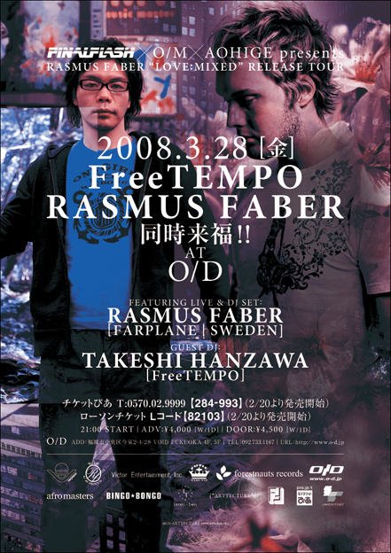 失礼致します。 「FreeTEMPO 」&「RASMUS FABER」 なんとO/Dに同時登場です!! 本日(2/20)、プレイガイド発売開始です!! ▼▼▼▼▼▼▼▼▼▼▼▼▼▼▼▼▼▼▼▼▼▼▼▼▼▼▼▼▼▼▼▼▼▼▼▼▼▼▼▼ やばい!ヤバイ!!YABAI!!! 雨の中、1000人以上を動員し、福岡クラブシーンの歴史を塗り替えた2008.01.19の一夜は記憶に新しいところ。 3/28(fri)、みんなの熱線(ホットライン)がつながる夢のような時間が戻ってきます。 今回もSPECAILなゲスト、 まずは、SWEDENストックホルムより、その奏でる音楽、DJスタイルか