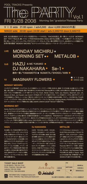 POOL TARCKS Presents "The PARTY Vol.1" 03.28.fri. @ MAGO http://www.club-mago.co.jp/ ■VIO SIDE Guest Live: Monday Michiru. LIVE: morning set. DJ: 鈴木一彰. ■MAGO SIDE DJ: HAZU. NAKAHARA. Se-1 -eleven- Metalob -from Osaka- Numata. MC: YUKAKO. VJ: imaginary flowers. □09PM~12AM ADV: 3500YEN. DAY: 4000YEN.@Lounge VIO □12AM~ ADV: 2000YEN. DAY: 2500YEN. @club MAGO 009PM~12AMにご来店の方は、12AM以降のマーゴでのパーティーにも そのままご入場頂けます。 08年、名古屋を拠点に