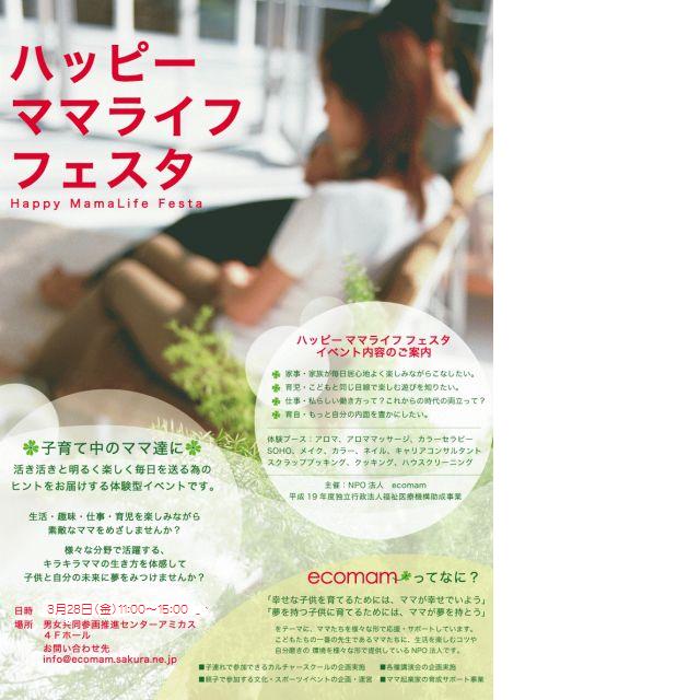 こんにちは!突然のイベントの書き込み失礼いたします。 福岡で子育て中のママたち向けの子づれOK!託児無料の カルチャー講座を各地の公共施設で開催している、NPO法人エコマムのれいこといいます。 春休みに親子で楽しめるイベントを企画しましたので、PRさせてください。 ハッピーママライフフェスタ vol.2 〜ママの夢・子どもの夢〜 子育て中だからとあきらめていませんか? 夢を仕事にしてキラキラ輝いているママがたくさんいます。そんなママたちの活躍を身近で体験できる、とっても楽しいイベントです。