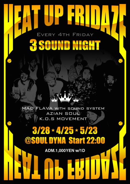HEAT UP FRIDAZE -3SOUND NIGHT- コミュです。↓↓↓↓↓↓↓↓↓↓↓↓↓ http://mixi.jp/view_community.pl?id=3175617 3/28金曜日@SOUL DYNA 岐阜県羽島郡岐南町上印食9丁目63−7 TEL 058-240-7999 22:00〜 ADM 1000YEN w/1D 【SOUND】 MAD FLAVA with SOUND SYSTEM AZIAN SOUL K.O.S MOVEMENT ★Heat Up Fridaze Introduction★ 岐阜を中心に精力的に活動する3つのHOT SOUND、 AZIAN SOUL、K.O.S MOVEMENT、MAD FLAVAが提案する \1000w/1Dで遊べる岐阜の新しいJUGGLIN NIGHT!! 今のジャマイカの流れを