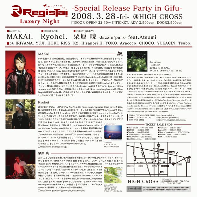 いよいよ今年2回目の「RegisTa! NAGOYA」の開催決定です しかも今回は岐阜に初上陸という事で“スペシャルバージョン”でお届けします そんな今回の「RegisTa!」ですがゲストには遂に3月5日にBMG JAPANからメジャーデビュー盤「GARDEN」をリリースし、話題の女性ボーカリスト青山テルマを起用する等 iTunesダンス・チャートで1位を獲得したすでに「RegisTa!」ではお馴染みの新世代クリエイター “MAKAI”。 そして「GARDEN」にもfeat.していてロングヒットのカバーアルバム第二弾「Cavaca2」が絶好調のm-floファミリー“Ry