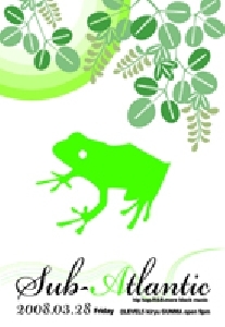 sub-atlantic ■hip hop,r'n'b,and more black music... ■2008.03.28.FRIDAY ■@LEVEL5 kiryu GUNMA ■start 9pm... ■entrance fee: 2,000yen(1D.) / with flyer 1,500yen(1D.) ■DJs: SHINGOk,和,KURIJUN,03,HALF ■LIVEact: aki,ERINA,J-ILL ■DANCEact: YUKIE+REINA,GUSTY ■STAFF: kaishi ■DesignGallery: PullTop ■artWORKs: nyanchu- ■foods: kusa,yuki ■mixCD present... 毎度ゆかいな宴が開かれる楽園Sub-Atlantic。そんな宴の音楽に誘われて、今宵は表現者たちが集う。 歌い手はsu
