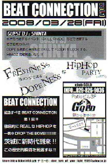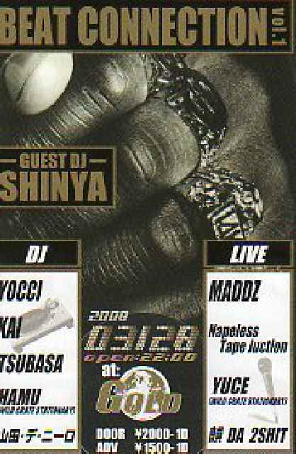 フレッシュネスなメンツで送るドープネスなパーティーDEF!!! その名も ビートコネクション!!!!!! イナタいヒップホップ 泥臭いヒップホップ 真っ黒なヒップホップを一晩中!!! 何はともあれステイアラヒップホップ!!!!!!! &ステイアラ 酒!!!! てな具合 詳細はこちら↓↓ Beat Connection 3/28 @土浦Club Gold Day2000/1d Adv1500/1d Guest DJ SHINYA DJ Tsubasa Kai Yocci Hamu 山田デ・ニーロ Live Youce MADDZ Napless Tape Junction 韻DA2SHIT 愛しのパリピーポー あなた こんなん感じでドロッピンシッ!!!