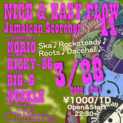 ◆NICE & EASY FLOW◆11 Jamaican Scorcher [Selector] NORIO(from道明寺) BIG-G(from Minority) RICKY-86(from Twin-B) NUCKLE (from cafe de Chillin') 3/28(金) cafe de Chillin'@水戸 START/22:30 Adm: \1000/1D