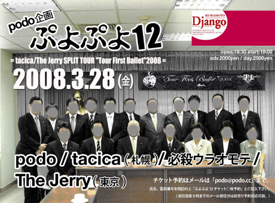 2008.03.28 (金) 熊本 Django [ぷよぷよ12] 〜tacica&The Jerry split tour "Tour First Ballet"2008〜 出演 ・podo ・tacica (札幌) ・The Jerry (東京) ・必殺ウラオモテ open18:30/start19:00 前売¥2000/当日¥2500 (ドリンク代別¥500) http://www.podo.cc/
