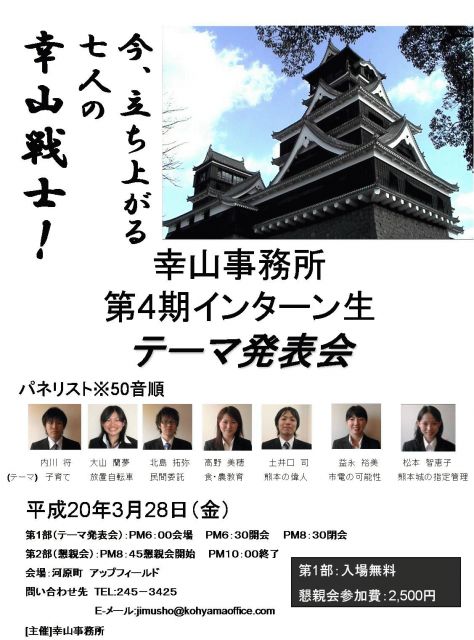 幸山事務所 主催の インターン生のテーマ発表会が 行われます。 インターン生の様々な 角度からの 「熊本」に関する プレゼンテーションを ぜひ みんなで共有し ちょっとだけでも ときには 「熊本」とか 「政治」とかに 興味・関心をしめしてみませんか? けっこうオモシロいです。 ・・・・・・・・・ ■今、立ち上がる七人の幸山戦士! 7名のインターン生が 下記テーマのもと発表します。 ・子育て ・放置自転車 ・民間委託 ・食・農教育 ・熊本の偉人 ・市電の可能性 ・熊本城の指定管理