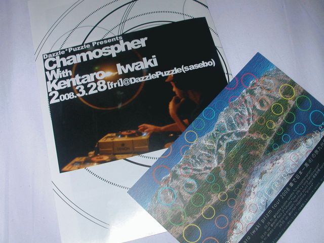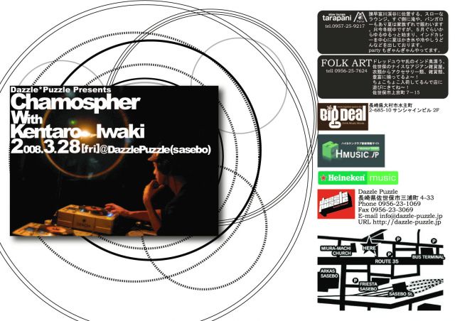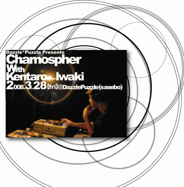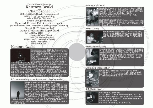 2008/03/28/fri 【chamospher+prizm】 @dazzle puzzle(佐世保) http://mixi.jp/view_community.pl?id=1529757 open 21:00〜nice morning adv.2000yen(w1D) day.2500yen(w1D) special guest DJ:kentaro iwaki(dub archanoid trim/blowman/kiwai graphic/denon dj) http://mixi.jp/view_community.pl?id=46526 guest DJ:T.B.(otonoha) guest LIVE:mahina apple band DJ:SEIYA(幻聴)/electrock/MIH◎JUN VJ:山修(Art of Noise) food:tarapani shop:FOLK ART kentaro iwaki: Dub Archanoid Trim(ダブ・アー