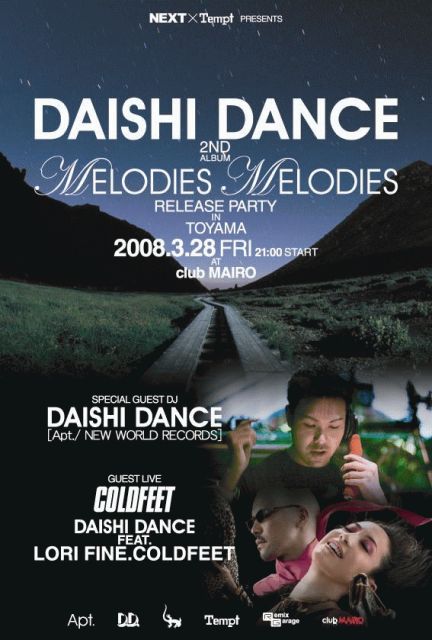 3月28日(金)21:00〜 NEXT×Tempt PRESENTS DAISHI DANCE 2ND ALBUM MELODIES MELODIES RELEASE PARTY in TOYAMA club MAIRO 出演 GUEST DJ:DAISHI DANCE GUEST LIVE:COLD FEET GUEST LIVE:DAISHI DANCE feat Lori Fine,COLD FEET DJ faM DJ SAWASAKI DJ moritahide ADV¥3000 DOOR¥3500 問い合わせ Tempt 076-465-1855 DAISHI DANCE(ダイシ ダンス) http://www.daishidance.jp/ 札幌を拠点にPLAYするHOUSE DJ。 箱の特性やクライアントに応じてメロディアスな HOUSEからマッシブなHOU
